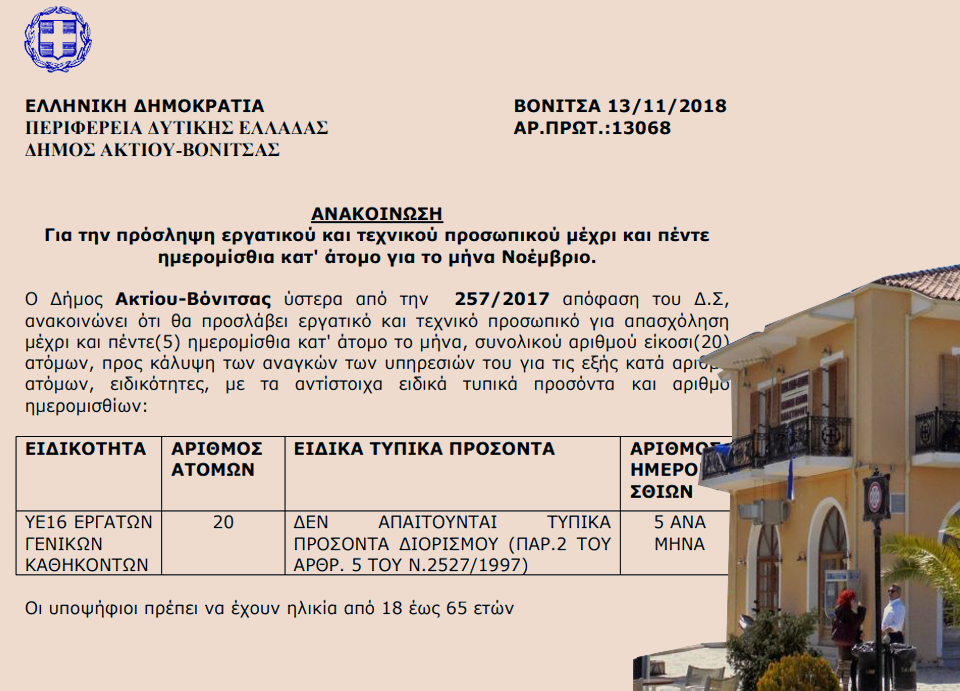 Στην πρόσληψη 20 εργατών γενικών καθηκόντων προβαίνει ο Δήμος Ακτίου-Βόνιτσας, το μήνα Νοέμβριο, για απασχόληση μέχρι και 5 ημερομίσθια κατ’ άτομο.