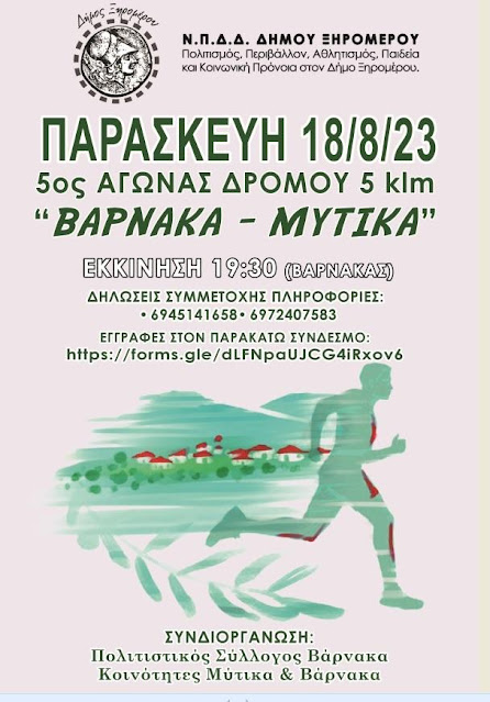 Όσοι επιθυμούν να δηλώσουν συμμετοχή στον Αλύζιο αγώνα δρόμου Βάρνακας - Μύτικας, που θα διεξαχθεί ημέρα Παρασκευή στις 18 Αυγούστου 2023, μπορούν να μπουν και να συμπληρώσουν την ηλεκτρονική φόρμα: